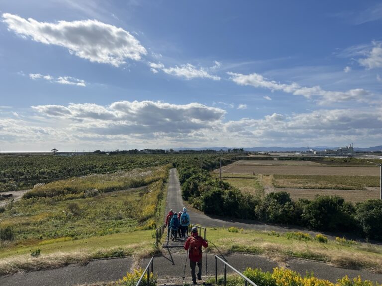 仙台空港を出発して、ハイキングマップブック(以下HMB)〈10-2、⑦969.17付近〉でトレイルルートに合流。千年希望の丘 交流センター、岩沼海浜緑地、長谷釜公園〈HMB10-3、③975.40〉を経て、阿武隈川の土手道に出ます。土手道を約4km歩き阿武隈大橋〈HMB10-4、②982.63〉へ。ここでトレイルルートを離れて約2km歩き、岩沼駅でゴール、解散します。約15kmの平坦な舗装路を歩くルートです。